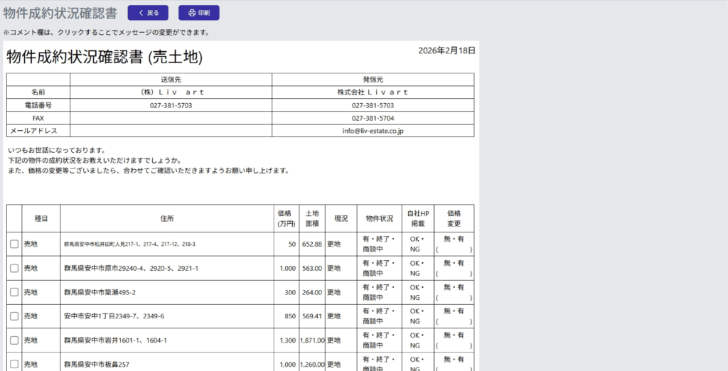 HP掲載中の他社様の物件状況を確認するためのシステムです。選択した企業様の物件一覧が作成され「物件がまだ紹介可能か」「金額に変更は無いか」などをPDFや紙ベースで出力でき、確認することができます。そのため、いつでもお客様に新鮮な情報を提供できます。